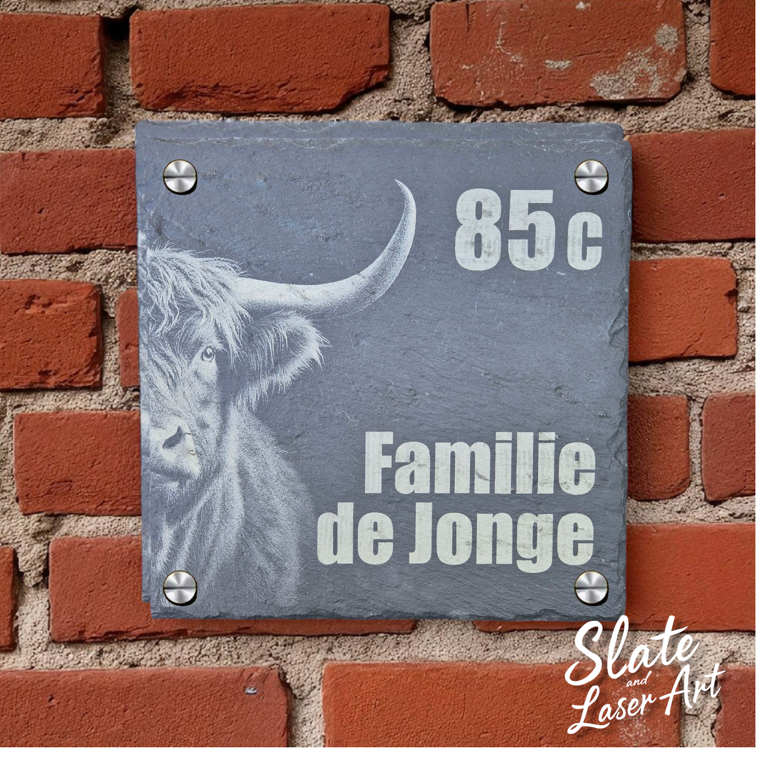 Geef je ingang of muur een unieke uitstraling met dit prachtige leistenen naambord van 20x20 cm, afgebeeld met een Schotse Hooglander. Personaliseer het bord met je eigen naam en eventueel huisnummer. Perfect voor jezelf of als bijzonder cadeau!